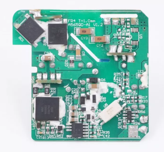 這款充電器內(nèi)部結(jié)構(gòu)緊湊,額外采用三塊小PCB板設(shè)計(jì),空間利用率高。此外小板子以及變壓器等元器件打膠加固,整流橋等主要發(fā)熱芯片也打膠幫助導(dǎo)熱,內(nèi)部穩(wěn)定性和散熱性能有保證。此外采用永銘高壓電解電容和云星低壓固態(tài)電容進(jìn)行濾波,用料扎實(shí)。