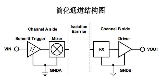 默認(rèn)輸出故障安全模式: 如果輸入側(cè) VDD 未通電,則輸出進(jìn)入默認(rèn)輸出故障安全模式高電平 |